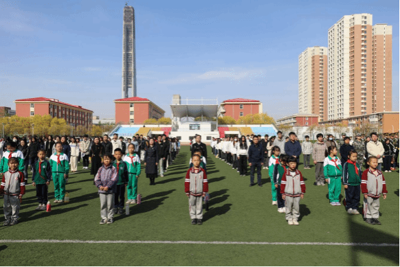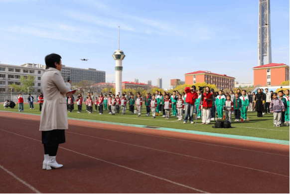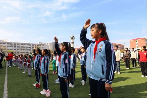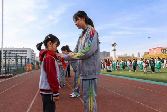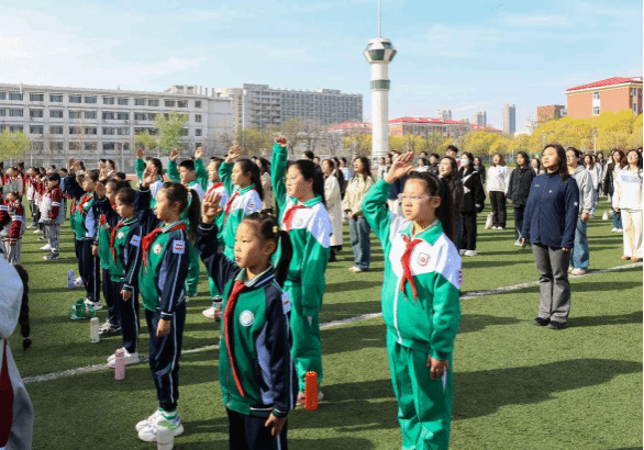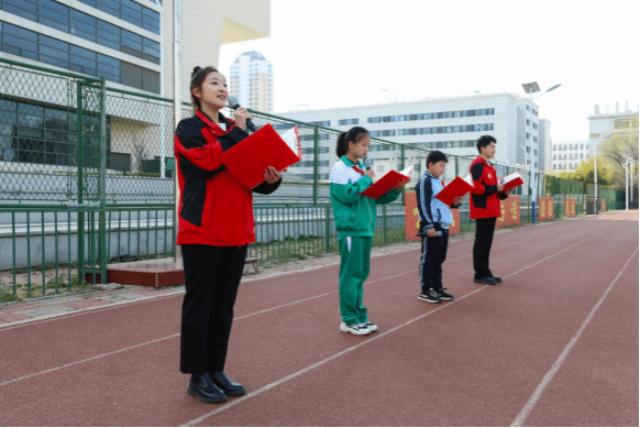 “每一粒扎根大地的生命,都带着先烈的体温生长。作为新时代的少年,爱国的火苗将永远在我们心中熊熊燃烧。……以渤海浪花为弦!以海河碧波为琴!弹奏这山河无恙的乐章!”学生代表我校食品科学与生物工程学院侯启轩、计算机与信息工程学院吴兆彤和中北第二小学朱婧琪、中北小学郭晨东4位同学共同带来演讲《思源奋进 强我中华》。从抗日烽火到农业科技攻关,两代人的声音让历史与现实交汇,00后大学生与10后少先队员的对话,是爱国精神的接续传承。演讲后,我校学生党员和援疆支教团等学生代表为少先队员戴上鲜艳的红领巾,传递了新时代青年听党话、感党恩、跟党走的信念。全体少先队员高唱《中国少年先锋队队歌》,抒发了同学们争做新时代好队员的热情。