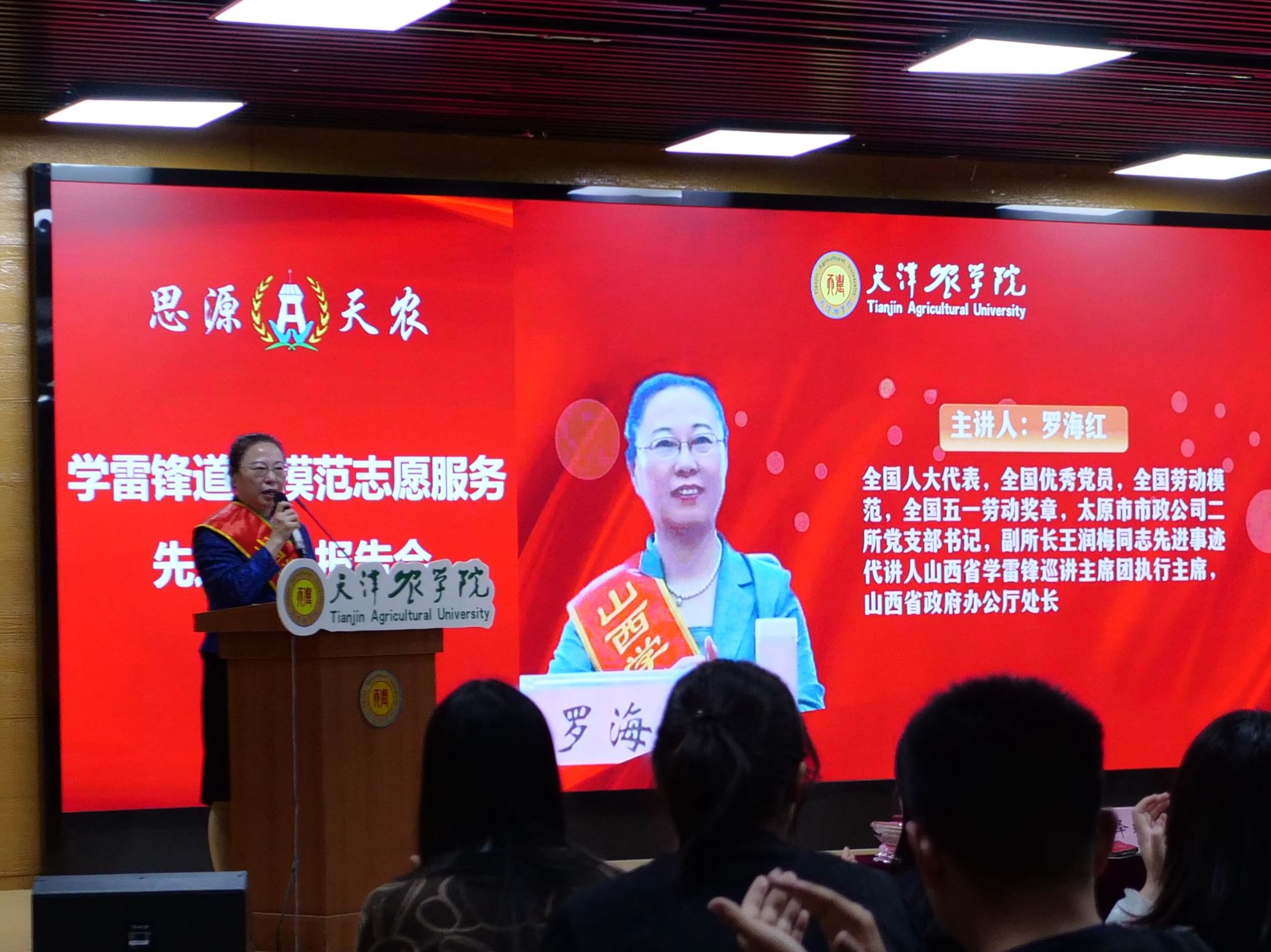 山西省学雷锋巡讲主席团执行主席、山西省五一劳动奖章获得者、山西省政府办公厅罗海红处长以《雷锋精神永传承,爱岗敬业献爱心》为题讲述了全国人大代表,全国优秀党员,全国劳动模范,太原市政建设管理中心二所党总支书记,副所长王润梅的事迹,王润梅干一行、爱一行、钻一行的敬业精神感染着每一位听众,罗海红结合我校“思源·奋进”文化育人任务目标,号召全体同学要厚植“爱党 爱国 爱农 爱校”情怀,并欢迎同学们到山西去,真正践行“把论文写在祖国大地上”的使命,以“向下扎根”的服务意识诠释青春本色。