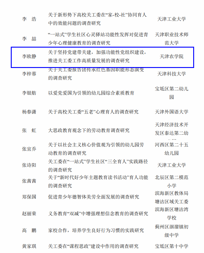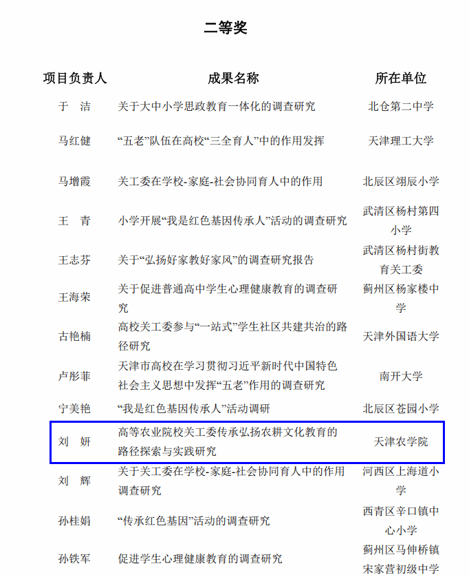 近日,天津市教育系统关工委下发《关于公布 2023-2024 年调研课题结项情况和优秀调研成果的通知》,经专家评审,我校组织申报的9项调研课题均予以结项,其中刘妍(园艺园林学院)、李欧静两位老师分获调研成果二等奖,我校关工委获优秀组织奖。