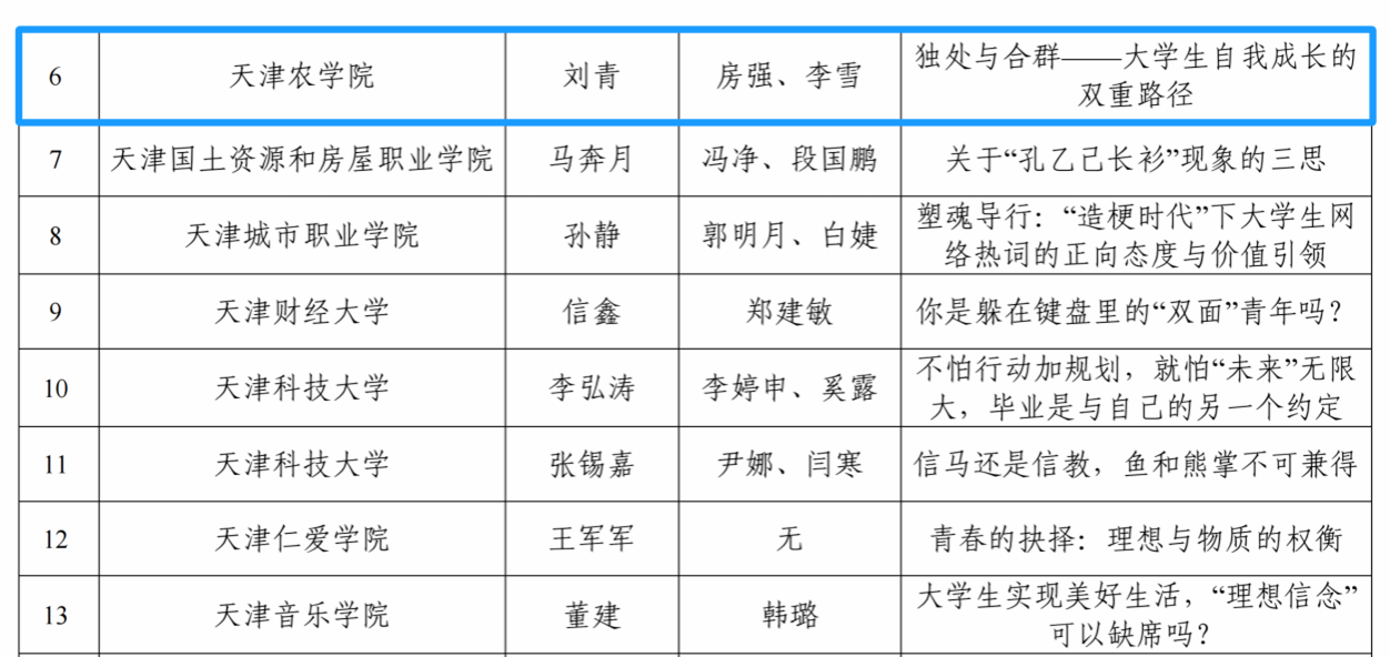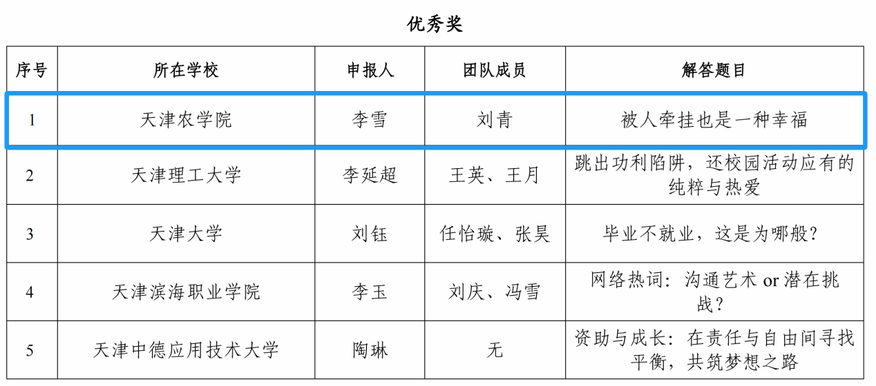 为进一步加强大中小学思想政治教育重点难点问题攻关,在天津市举办的2024年大中小学思想政治教育疑难问题解答征集活动中,我校李雪老师的《被人牵挂也是一种幸福》,刘青老师的《独处与合群——大学生自我成长的双重路径》荣获优秀奖。
