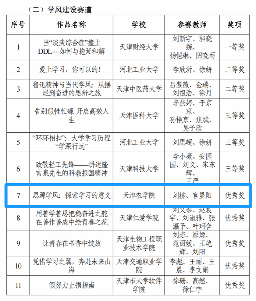 为聚焦时代热点话题,深入学生一线,了解学生所思所想,直面学生的困惑症结,深化爱党爱国爱社会主义教育,在天津市举办的2024年高校辅导员思想政治教育“精彩一课”视频公开课大赛中,我校荣获“优秀组织单位”,我校辅导员章晨茜老师获职业规划与就业创业指导赛道二等奖,辅导员刘柳老师获学风建设赛道优秀奖。