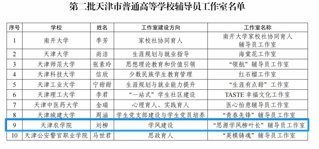 在天津市举办的第二批普通高等学校“辅导员工作室”遴选与建设活动中,经学校申报、市教育两委组织专家评审委员会评审,我校“思源学风柳叶长”辅导员工作室获批2024年天津市高校第二批辅导员工作室。