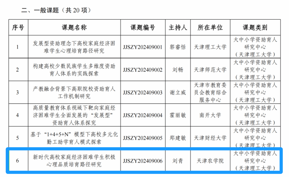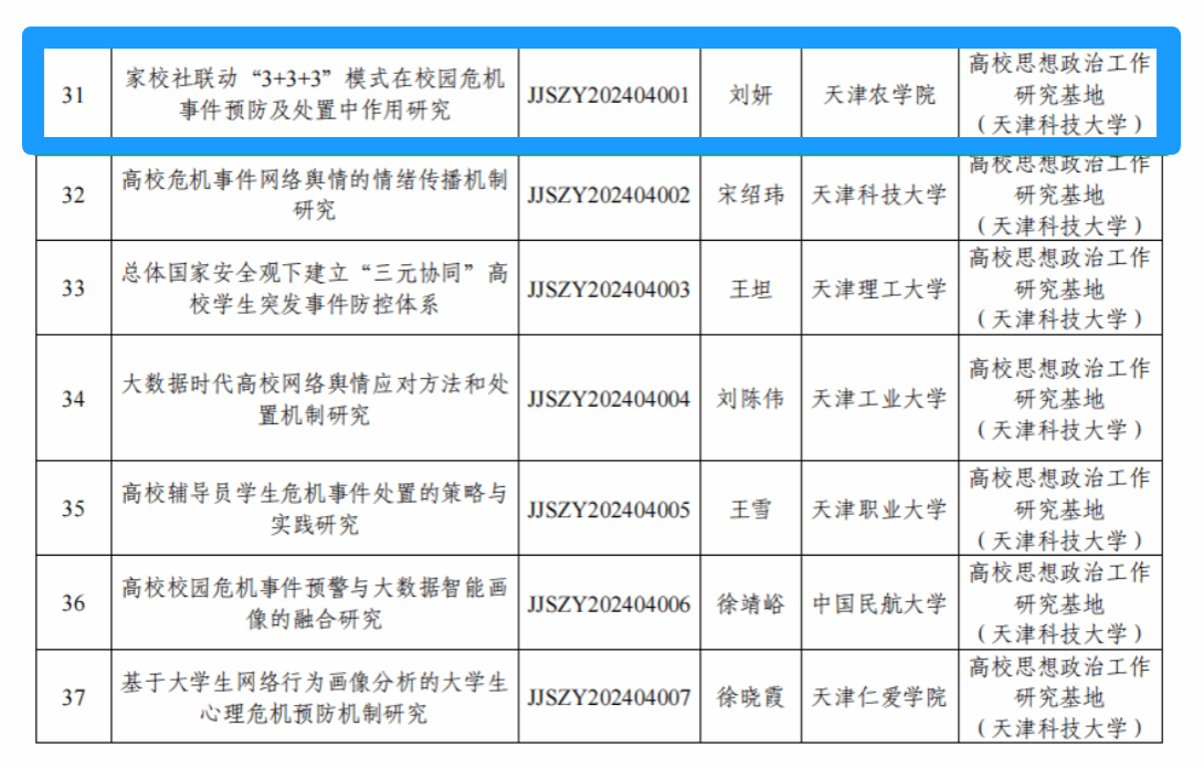 为进一步提高我校辅导员的理论素养和科研水平,我校精心组织校级、市级思想政治工作专项课题申报研究。在市教育两委2025年度天津市高校思想政治工作精品项目立项中,我校辅导员1个项目获批;在2024年天津市大中小思想政治工作专项课题申报中,我校辅导员2个项目获批立项。